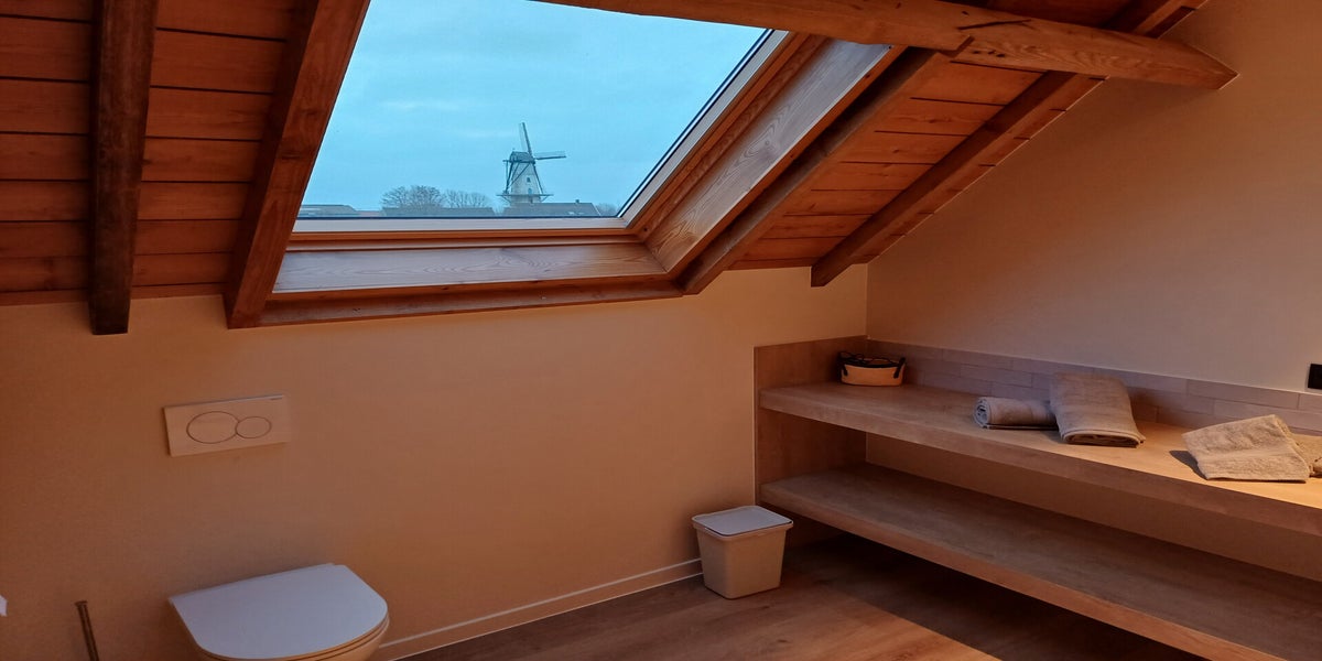 Deze twee kamers zijn gelegen op het eerste verdiep, in het linker gedeelte van de B&B. Ze hebben toegang tot een gezamenlijk terras en een gezellige zithoek onder het authentieke dakgebinte. Vanop het terras heb je uitzicht op het achterliggend weiland, onze prachtige notelaar, de Couchez- en de Wullepitmolen. Je kan er genieten van de ochtendzon.